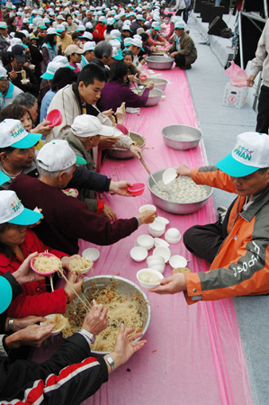 臺灣省宜蘭縣羅東中山公園廣場二十九日舉辦“立委”選舉造勢大會,近中午時(shí),主辦單位在舞臺擺上十多盆的炒米粉及魚丸湯,兩三百名民眾爭相搶食!爸醒肷纭眻D 沈如峰 攝