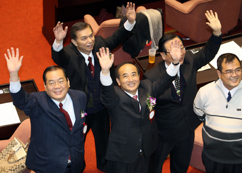 臺(tái)灣地區(qū)第七屆“立法院”二月一日選舉“立法院長(zhǎng)”,中國(guó)國(guó)民黨籍“立委”王金平(前左二),以85票對(duì)27票打敗對(duì)手,確定連任“立法院長(zhǎng)”,中國(guó)國(guó)民黨籍“立委”曾永權(quán)(前左一)則高票當(dāng)選“副院長(zhǎng)”。(“中央社”圖;郭日曉攝)