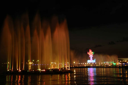 高雄燈會藝術(shù)節(jié)二日閉幕,閉幕前再表演水舞秀供民眾觀賞!爸醒肷纭眻D 陳朝福 攝