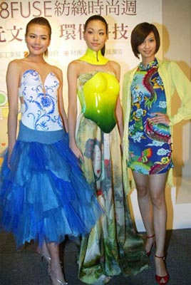臺灣民間信仰媽祖,現(xiàn)在有了美麗的代言人。臺灣官方主辦的“FUSE紡織時尚周”活動結(jié)合“大甲媽祖國際觀光節(jié)”,從全省兩百位十六至二十四歲的報名者中選出前三名,成為臺灣首屆媽祖代言人,二十五日公開亮相,圖為前三名王婷儀(左起)、葉雅馨、陳紫嫻,看似夸張的馬甲,是設計師以媽祖護佑臺灣有如穿著盔甲為靈感,而鎮(zhèn)瀾宮的澡井、八仙彩甚至是媽祖供桌上的青花瓷花瓶,都幻化做時尚媽祖的彩衣。臺灣《中國時報》圖 陳信翰 攝