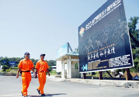 金門(mén)八二三炮戰(zhàn)五十周年即將到來(lái),臺(tái)灣軍方和金門(mén)縣政府合辦系列紀(jì)念活動(dòng),并在“小三通”水頭港區(qū)布置巨幅看板,提醒“戰(zhàn)爭(zhēng)無(wú)情、和平無(wú)價(jià)”。圖:“中央社”