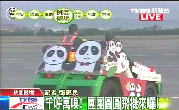 運輸贈臺大熊貓“團團”、“圓圓”的臺灣長榮班機下午5時許抵達桃園機場,圖為桃園機場的車輛被打扮成熊貓風(fēng)格。 臺灣TVBS圖