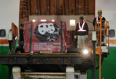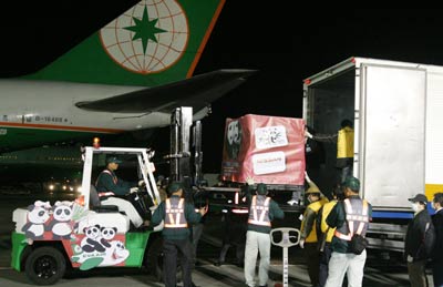 贈(zèng)臺(tái)大熊貓抵達(dá)臺(tái)北桃園機(jī)場(chǎng),圖為工作人員展開(kāi)裝載作業(yè) “中央社”圖