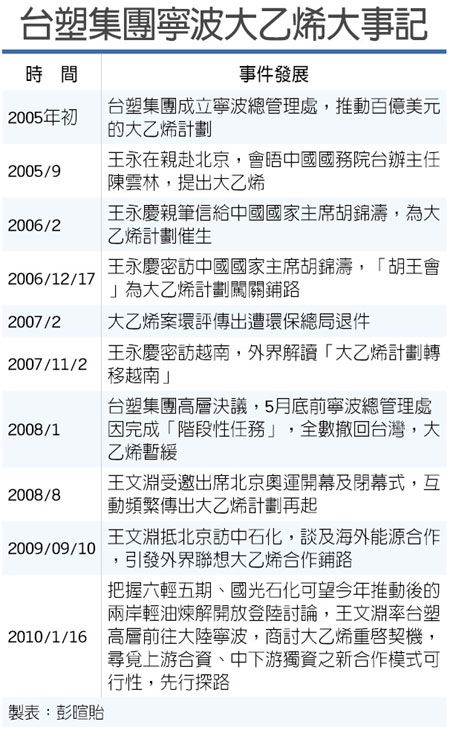 “大乙烯計劃”原是臺塑寧波石化的二期專案,包括年產(chǎn)1,000萬噸的煉油、年產(chǎn)120萬噸的乙烯裂解廠,60萬噸的丙烯廠、16.7萬噸的丁二烯廠,以及芳香烴系列,投資總額是100億美元,是臺塑集團(tuán)創(chuàng)辦人王永慶先前積極推動的登陸投資案。