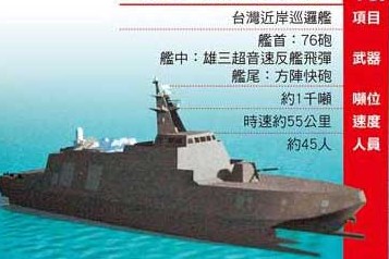 對于研發(fā)新型近岸巡邏艦,海軍司令部表示,海軍希望建立“不對稱戰(zhàn)力”,因此一直朝小而精、小而巧、小而強的方式,籌建現(xiàn)代化防務(wù)武力,以滿足臺澎防衛(wèi)作戰(zhàn)的需求。