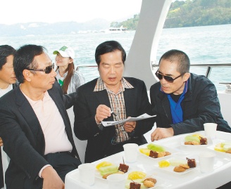 郭臺(tái)銘與李朝卿昨天并陪著張藝謀搭船游湖。為了讓張藝謀能坐在視野最好的船弦邊座位,郭臺(tái)銘還親自將靠船弦的桌上餐盤移到另一桌,笑著招呼張藝謀就座。