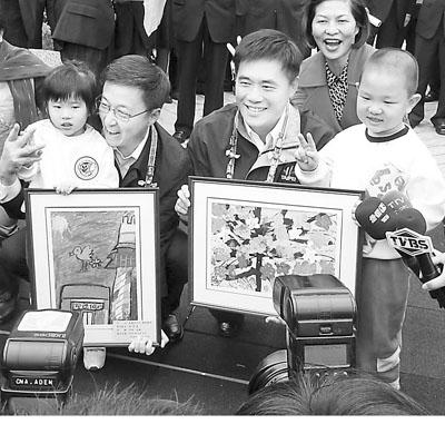 由于沒有安排接駁車,記者打車趕往下一站——北投垃圾焚化處理廠。由于此項(xiàng)參觀也不對(duì)外,記者又趕到附近的一家幼兒園等候。在臺(tái)北市長郝龍斌的陪同下,韓正與此間的小朋友見面,小朋友為兩位市長唱歌跳舞,又把自己畫的畫送給市長,韓正把帶來的上海世博會(huì)吉祥物海寶送給小朋友,又和他們合影留念,小朋友個(gè)個(gè)樂得手舞足蹈。