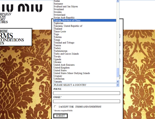 中新網(wǎng)6月5日電 據(jù)臺灣TVBS報道,知名咖啡連鎖店日前才因為網(wǎng)頁把臺灣列為中國一省遭到島內(nèi)一些消費者發(fā)動拒買抗議,現(xiàn)在又傳出意大利高級皮件品牌MIUMIU,在官網(wǎng)訂閱電子報里的國家欄,將臺灣列為中國一省。對此,綠營又拿出來說事。
