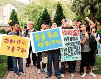 據(jù)臺灣《聯(lián)合報》報道,“打破宿舍門禁、落實性別平權(quán)”、“解放師大性教育,追求友善好校園”,學(xué)生高舉海報、大聲呼喊口號,師大化學(xué)系石姓學(xué)生是在網(wǎng)絡(luò)上號召學(xué)生,他們從校門口游行到男三宿舍,但過程中插曲不斷,正反意見兩極。