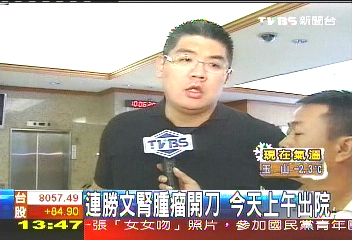 連勝文住院開刀的消息,是在臺(tái)北榮總中正樓三樓手術(shù)等候室曝光,當(dāng)時(shí)該等候室的“病患手術(shù)動(dòng)態(tài)屏幕”,跑馬燈秀出連勝文的名字,有病家看到北榮高層向連戰(zhàn)夫婦說明病情。