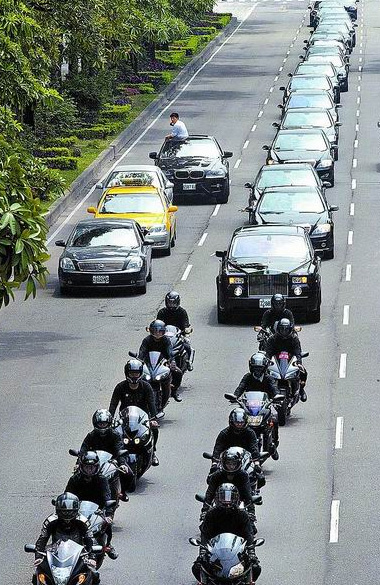 昨迎靈隊伍由12輛黑色重型摩托車前導,36輛勞斯萊斯、奔馳、BMW等名車從喪宅出發(fā),車隊浩浩蕩蕩綿延逾一公里,引人側目。