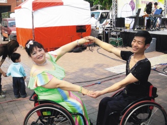 3年前梁春錦罹患乳癌,手術后以運動抗癌,她游泳、跳輪椅國標舞及練瑜珈。蘇俊源為陪伴妻子,也一起練習,兩人成為舞伴,也加入志工,經(jīng)常參加活動,夫妻倆坐著輪椅跳國標舞,鼓勵了許多殘障者。