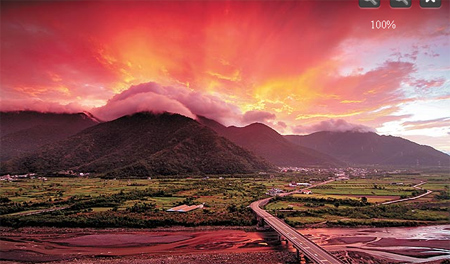 宜蘭南澳小學老師蔡沛旻昨清晨5時許,拍到南澳山區(qū)滿山火云,染成血紅的山頭向蒼穹激射出萬道紅光,仿佛火山爆發(fā)漫山熊熊烈火、又似盤古開天的氣勢,加上云彩翻山越嶺,氣勢壯麗磅礡,美妙的天象只維持5分鐘,已讓人驚嘆不已。