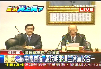馬英九曾于2005年首次當(dāng)選國(guó)民黨主席,2007年2月13日,因在臺(tái)北市長(zhǎng)任內(nèi)“特別費(fèi)”的使用,而被臺(tái)灣“高等法院檢察署”起訴(后經(jīng)臺(tái)灣法院宣判無(wú)罪),他曾承諾若遭起訴即辭去國(guó)民黨主席職務(wù),乃于同日請(qǐng)辭黨主席并正式宣布參選2008年“大選”。