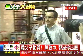 下午14時(shí)10分左右,陳致中一身輕便裝扮,準(zhǔn)時(shí)進(jìn)入臺(tái)北法院,準(zhǔn)備到第七法庭開(kāi)庭。但是由于陳水扁早上的庭訊遲遲未能結(jié)束,所以直到15時(shí)47分左右,兩人才見(jiàn)到面。
