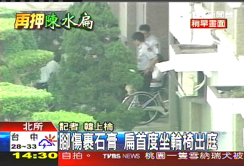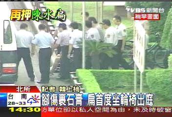 十幾名看守所人員層層戒護(hù),送陳水扁上車,前往臺(tái)北地方法院開庭。十幾名看守所人員中,有人負(fù)責(zé)推輪椅,有人負(fù)責(zé)抱著陳水扁上車,也有人拿著攝影機(jī)全程錄像,就怕一有疏漏會(huì)引發(fā)爭(zhēng)議。