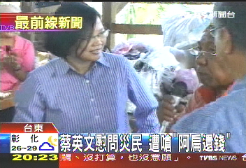 蔡英文由“立委”陳瑩、民進(jìn)黨縣長(zhǎng)參選人劉棹豪陪同到金峰鄉(xiāng)、太麻里鄉(xiāng)慰問災(zāi)民,在旁婦人洪玉桂突然嗆聲:“別作秀了”、“陳水扁把錢拿回來,大家都有救了!”另名婦人也說:“我只要一億就好,就能重建家園!”