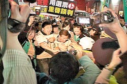 中新網(wǎng)11月25日電 據(jù)臺灣《中國時報》報道,國民黨主席馬英九24日晚在新竹縣新豐鄉(xiāng)及湖口鄉(xiāng)掃街拜票,為黨籍縣長候選人邱鏡淳造勢時,與民進黨縣長候選人彭紹瑾的隊伍相遇,雙方支持人馬爆發(fā)推擠沖突。雙方人馬短兵相接,一時旗桿橫飛,場面混亂,前后歷時五分鐘,沒有人員受傷。