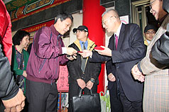 吳敦義在拈香祝禱期間,在大佛風(fēng)景區(qū)內(nèi)的大雄寶殿廣場(chǎng)旁親自種下菩提樹(shù),并發(fā)放888個(gè)福袋給前來(lái)游玩的民眾。