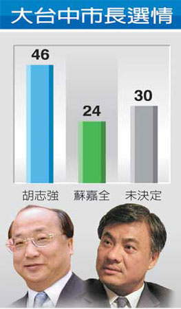 據(jù)報(bào)道,臺(tái)中市四名官警出現(xiàn)在黑道大哥被槍擊死亡現(xiàn)場(chǎng),引發(fā)社會(huì)嘩然,對(duì)年底大臺(tái)中市長(zhǎng)選情的沖擊備受關(guān)注!堵(lián)合報(bào)》選情調(diào)查發(fā)現(xiàn),國(guó)民黨提名的胡志強(qiáng)聲勢(shì)仍居上風(fēng),目前獲得46%選民支持,民進(jìn)黨蘇嘉全支持率24%,30%未決定。
