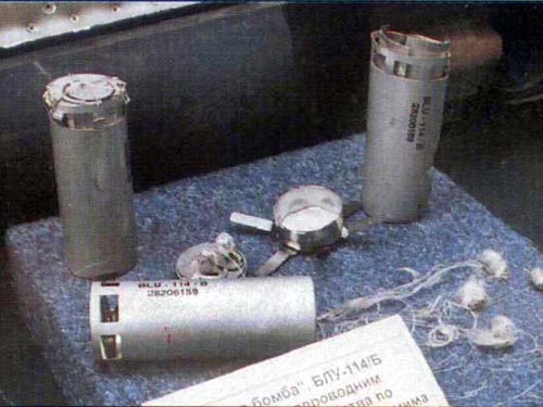 據(jù)美國科學家網(wǎng)站資料指出,美軍石墨炸彈在空軍編號為BLU─114/B,是透過在易拉罐大小的罐內(nèi)裝進大量石墨絲,然后將這些石墨罐再裝進較大的集束彈體中,以子母彈的方式進行投射,石墨彈在散開后,尾部還會掛載降落傘,以利于讓罐內(nèi)石墨絲大面積散開,并平均落在發(fā)電廠或高壓電纜上,讓電纜瞬間燒毀。