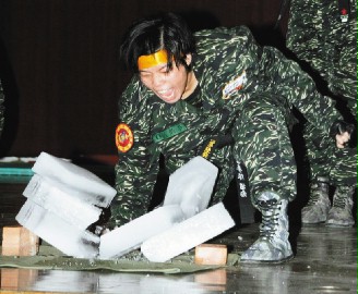 臺陸軍體干班將由女兵負責表演“刺槍擊破”,陸戰(zhàn)隊莒拳隊則由具有跆拳道五段的女兵表演破冰、破磚的猛勁。