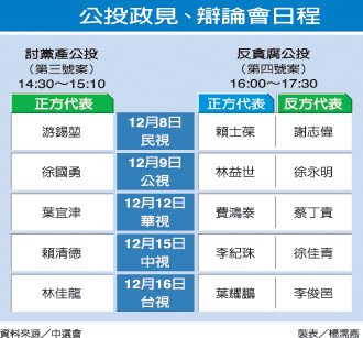 由于“討黨產(chǎn)”案沒有人提出反對意見,因此只有提案的正方單方論述;“反貪腐公投”案則因綠營提出反對看法,有正、反方的辯論。