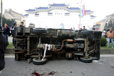 中新網(wǎng)12月6日電 臺北中正紀(jì)念堂前發(fā)生意外。上午十一時左右,有男子駕駛貨車沖撞“大中至正”門口的人群,其中一名正在采訪的記者受重傷。