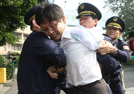 中新網(wǎng)12月11日電 臺灣第三社會黨發(fā)言人林致真、楊偉中今天上午前往臺當局“行政院”門口,剪斷掛在圍墻的“牽手護臺灣,加入聯(lián)合國”布條,與警方發(fā)生沖突。