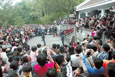 據(jù)臺(tái)灣《聯(lián)合報(bào)》報(bào)道,臺(tái)軍方宣布兩蔣陵寢今天起暫停對(duì)外開(kāi)放,儀隊(duì)已于二十三日撤哨,駐守慈湖三十二年的“憲兵”也于晚間撤離。一早即吸引各地民眾涌入慈湖、頭寮兩處陵寢,有人表達(dá)懷念,有的來(lái)看熱鬧,慈湖每整點(diǎn)的儀隊(duì)交接更是擠爆陵寢區(qū),警方估算當(dāng)天共有七萬(wàn)多人涌進(jìn)大溪。