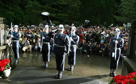 中新網(wǎng)12月24日電 昨天下午五時(shí),臺(tái)灣慈湖大溪陵寢進(jìn)行最后一班儀隊(duì)交接,儀隊(duì)“憲兵”高喊“敬禮”后撤哨,慈湖和頭寮兩蔣陵寢隨之關(guān)閉。目睹歷史的一刻,有民眾哽咽落淚。