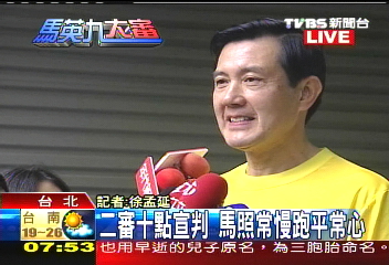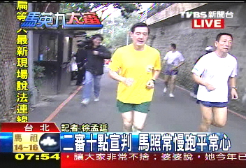 據(jù)臺灣TVBS報(bào)道,馬英九穿著一件黃色輕便的運(yùn)動服,同往常一樣在六點(diǎn)四十分就從家門出發(fā)要去慢跑。記者問他對二審的判決有沒有信心,馬英九說,慢跑的時(shí)候他暫時(shí)不想回答這個(gè)問題。