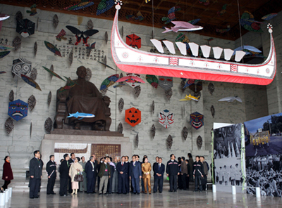 據(jù)臺灣中廣新聞報道,進入主建筑物的二樓銅像大廳可以看到,蔣介石銅像仍維持原貌,但整個大廳裝飾了巨幅海報與歷史政治運動照片等,還垂掛風(fēng)箏以及“原住民“達悟魚舟紙做模型。