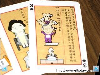 據(jù)臺(tái)灣東森新聞報(bào)道,在“立委”選舉前,國(guó)民黨文傳會(huì)制作了20萬份“臺(tái)灣向前行”撲克牌,把陳水扁家族和臺(tái)當(dāng)局成員一個(gè)個(gè)列出。被放在“梅花K”的陳水扁,上面寫著“偶臭了嗎?”,還用手挖著鼻孔,旁邊則列出陳水扁包庇貪污犯行“一妻、二秘、三師、四親家、五總管”。