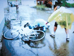 杜正勝離開水璉中途學校后前往預計中途休息點的新社小學,不料新社小學旁水泥道路有些坡度,加上連日陰雨地面濕滑、長青苔,同行隊友見杜正勝騎得有些吃力,好心推他一把,接著杜正勝因地面濕滑而摔跤。