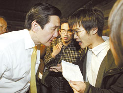 不過,當(dāng)座談進(jìn)入嚴(yán)肅的教育、社會(huì)福利、兩岸問題,馬英九馬上變身成“馬教授”身分,一板一眼。馬英九并期許大學(xué)生“更用功一點(diǎn)”,“希望各位為了自己、為了臺(tái)灣能更用功!薄案窬指笠稽c(diǎn)!