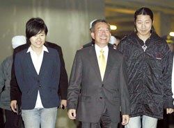 謝長(zhǎng)廷(中)與卡神楊蕙如(左)等一道出席。(中國(guó)時(shí)報(bào)圖;黃國(guó)書攝)