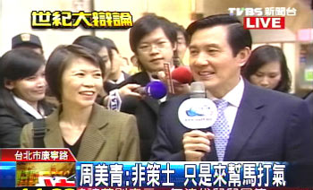 此次辯論會,周美青一樣參與了討論,也一樣非常地嚴(yán)格。她建議馬英九,多說一些小老百姓日常生活關(guān)心的話題,講述過程要簡單,賣弄文字得避免,最重要的是不可長篇大論。當(dāng)記者詢問選戰(zhàn)是否應(yīng)偏向政策討論勝于口水戰(zhàn),她回答馬一直都沒打口水戰(zhàn)。