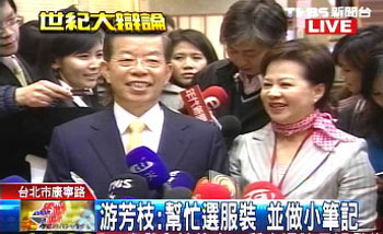 據(jù)“中央社”報道,民進(jìn)黨候選人謝長廷穿上游芳枝挑的深藍(lán)色西裝、黃色領(lǐng)帶,看起來相當(dāng)有精神。游芳枝也幫謝長廷貼心記了許多小筆記,寫在小卡片上。