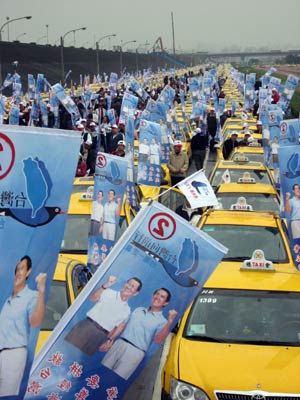 中新網3月10日電 向來被視為挺綠勢力的臺灣“全民出租車聯(lián)誼會”決定棄綠轉藍,在總會長邱奕枝號召下,上午陸續(xù)聚集兩千五百輛出租車并成立馬蕭后援會,場面壯觀。