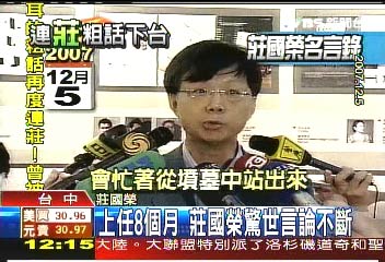 中新網(wǎng)3月17日電 臺(tái)當(dāng)局“教育部”主任秘書莊國(guó)榮辱罵馬英九父親馬鶴凌,昨晚已經(jīng)為此下臺(tái)。據(jù)臺(tái)灣TVBS報(bào)道,莊國(guó)榮2007年8月1日以“法學(xué)專家”出任臺(tái)“教育部”主秘,語(yǔ)出驚人的風(fēng)格為他在8個(gè)多月的任期中留下不少“驚世言論”。