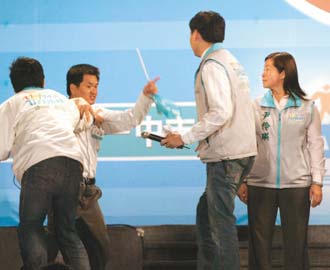 謝長(zhǎng)廷18日在云林舉辦造勢(shì)晚會(huì),執(zhí)行總干事李應(yīng)元介紹前“臺(tái)聯(lián)黨”“立委”尹伶瑛(右)加入民進(jìn)黨時(shí),一名民進(jìn)黨支持者(左二)沖上臺(tái)辱罵尹伶瑛。(圖:臺(tái)灣《聯(lián)合報(bào)》)