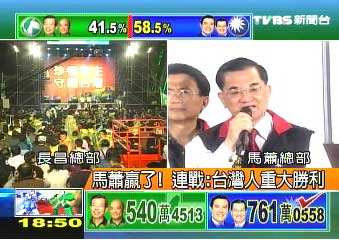 中新網(wǎng)3月22日電 據(jù)臺灣TVBS報道,2008年的臺灣地區(qū)領導人選舉結果出爐,馬英九、蕭萬長確定以得票超過7百萬張,超過58%的得票率當選。國民黨榮譽主席連戰(zhàn)在馬蕭總部發(fā)表談話時說,“選舉的結果,真正的給我們帶來了一個不一樣的明天,一個和諧融洽的社會,大家都是一家人,不再有任何的對立、仇恨!
