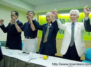 為展現(xiàn)大團結氣氛,謝長廷及辜、蔡三人還以麻繩將一堆象征民進黨員的木頭捆起來,象征民進黨的團結。