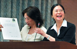 蔡煌瑯質(zhì)詢時間已超過很久,又冷不防說了一句,“你有沒有發(fā)現(xiàn)主席(李嘉進(jìn))讓我繼續(xù)質(zhì)詢你?”頓時引來哄堂大笑,蔡補一句說,“你知道在國民黨的處境了哦!幸媛姐,回來吧,回來中心思想吧,那個位置很燙啦!很燙啦!”經(jīng)過一整天的炮火轟炸,“兩岸人民關(guān)系條例修正草案”順利通過初審,賴幸媛也明顯地松了口氣。