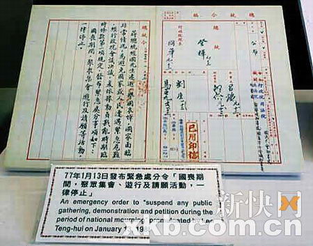 臺“總統(tǒng)府”9日上午開放民眾參觀,展覽室內(nèi)展出歷任“總統(tǒng)”文物及公文稿,據(jù)臺灣媒體9日報道,其中包括1988年蔣經(jīng)國逝世時,馬英九受命用毛筆撰寫的緊急處分令真跡,規(guī)范在“國喪”期間,全臺禁止聚眾集會、游行、請?jiān)傅然顒樱?dāng)時馬英九是“總統(tǒng)府”第一局副局長,簽出來的文稿還要層層上報,由長官批示,最后由繼任“總統(tǒng)”的李登輝批定。