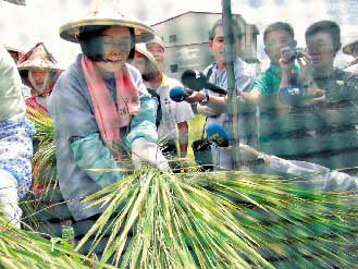 從未割過(guò)稻的蔡英文,跟著農(nóng)民左手抓起一把稻穗,接著右手以鐮刀割下,一開始動(dòng)作有些生疏,第二次即有模有樣,她興奮地將自己的收成高高舉起,成為鏡頭獵取對(duì)象。