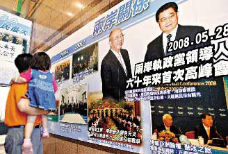 趕在7月4日大陸觀光客首發(fā)團(tuán)來臺(tái)前夕,國民黨2日連夜重新布置一樓大廳的兩側(cè)墻面,將原先的國民黨創(chuàng)黨113周年紀(jì)念展照片全數(shù)撤下,換成以“兩岸關(guān)系雨過天晴”等為主題的照片展,其中“胡連會(huì)”與“胡吳會(huì)”的歷史鏡頭,被放大貼在一樓大廳的左側(cè)墻面,所有訪客進(jìn)入大廳時(shí),都會(huì)看見吳伯雄與胡錦濤的大合照。
