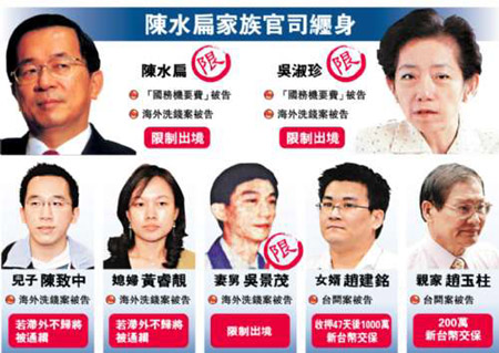 陳由豪對陳水扁“黑金疑云”開出關(guān)鍵第一槍之后,引發(fā)多米諾骨牌效應(yīng),接下來的四年,每次陳家曝光新的貪腐丑聞,臺灣老百姓都被嚇得目瞪口呆。陳水扁2004年連任后實(shí)行財(cái)產(chǎn)信托,申報(bào)財(cái)產(chǎn)從1994年任臺北市長前的1000萬元,飆漲到2003年底的7000萬元,股票市值從最初的55萬增至3億多元;2004年,媒體爆出吳淑珍收受SOGO百貨總值880萬元購物禮券,介入SOGO經(jīng)營權(quán)爭奪戰(zhàn);2006年5月,陳水扁的女婿趙建銘被指控涉嫌臺開股票內(nèi)線交易;2006年6月,吳淑珍卷入“國務(wù)機(jī)要費(fèi)案”。