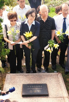 民進黨主席蔡英文(左二)25日上午帶領(lǐng)前主席許信良(右二)等人分別前往前主席江鵬堅和黃信介墓園舉行追思會。(圖片來源:臺灣《聯(lián)合報》)